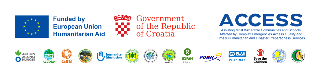 The Assisting the Most Vulnerable Communities and Schools Affected by Complex Emergencies Access Quality and Timely Humanitarian and Disaster Preparedness Services (ACCESS) Project is a multi-year, multi-sectoral humanitarian and disaster preparedness initiative funded by European Union Humanitarian Aid. Since 2023, ACCESS has helped over 350,000 people across the country. The project serves the most affected, underserved, difficult-to-reach communities in the Philippines, where natural hazards, conflict, displacement, and intensifying climate-related risks continue to threaten lives and livelihoods. It is implemented by a consortium of 14 local and international organizations: ACCORD, Action Against Hunger Philippines, CARE Philippines, Community Organizers Multiversity (COM), Humanity & Inclusion Philippines, Integrated Mindanaons Association for Natives (IMAN), Kadtabanga Foundation for Peace and Development Advocates, Mindanao Organization for Social and Economic Progress (MOSEP), Oxfam Pilipinas, People’s Disaster Risk Reduction Network (PDRRN), Plan International Pilipinas, Save the Children Philippines, United Youth for Peace and Development (UNYPAD), and United Youth of the Philippines – Women (UnYPhil-Women).